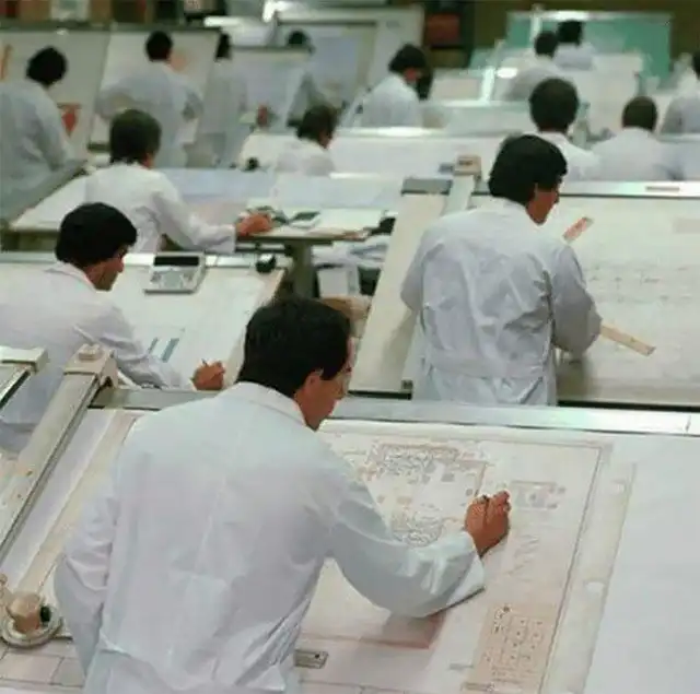 До появления автокада - да и вообще программ разработки чертежей на компьютере - всю документацию делали на ватмане от руки. Десятки инженеров сидели в оупэн-спейсах, а их инструментами были: кульман (инженерная доска), набор карандашей и хорошие знания. Весь процесс был трудоемким и требовал большого старания - в случае ошибки приходилось весь чертеж делать заново. И это было еще не так давно - чуть более трех десятков лет назад; сейчас сделать чертеж гораздо проще, но вот культура инженерного дела уже совсем не та.